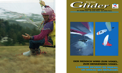 Dieter Strasilla subsequently combines his art of sailing uphill with the ecstacy of flying down. In 1980, he sails up Aletsch Glacier to Jungfraujoch on skis, then takes off in the direction of the Bernese Oberland. The next destination is located in France. In 1981, he sails up Vallee Blanche, waits for a favorable wind direction on the peak of Aiguille du Midi and flies towards Chamonix the next day. The times of secretive experiments away from the public eye are over: Famous magazines like "Die Schweizer Illustrierte", "Bunte" oder "Paris Match" do reports on the daredevil gliding and flying artists. Dieter and Andrea try to commercialize their art: Andrea Kuhn has a go at being a flight instructor in his windsurfing school in Oberengadin. Dieter Strasilla has his chutes produced in Italy, starting in 1981. Few people are interested in the gear, though. Apparently, the moment the new type of sport is able to find general approval has not yet come. In 1984, Hugo Stamm of the "Schweizerischer Tagesanzeiger" contacts the Federal Agengy Of Aviation asking them if they had already heard about the new flying device. Fritz Bigler, inspector for engingeinoperative flight, has a negative answer. He expects the new chute to be covered by the hang-glider regulations, though and points out it would be easiest if the paragliding schools joined the Swiss Hang-Glider Association.